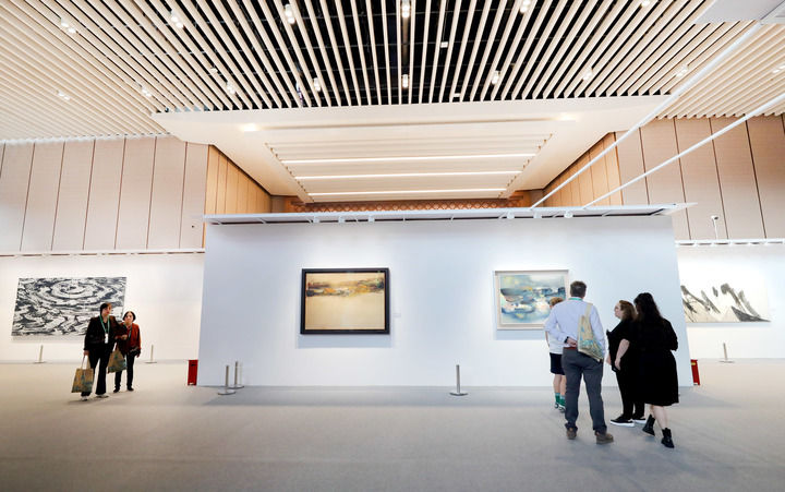 11月9日,觀眾在第七屆進(jìn)博會(huì)國(guó)際現(xiàn)當(dāng)代藝術(shù)專區(qū)觀看繪畫藝術(shù)展品。新華社記者方喆攝