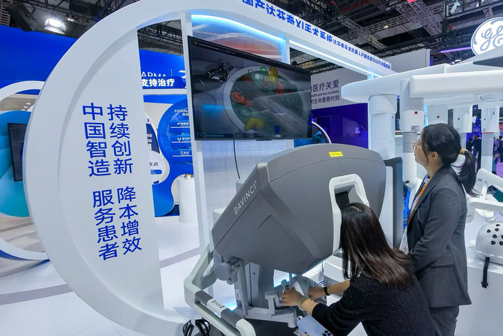 11月8日,一名參觀者(左)在第七屆進(jìn)博會(huì)醫(yī)療器械及醫(yī)藥保健展區(qū)復(fù)星醫(yī)藥展臺(tái)體驗(yàn)操作一款外科手術(shù)機(jī)器人。新華社記者張鋮攝