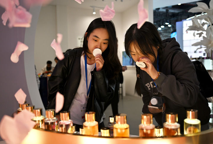 11月9日,觀眾在第七屆進(jìn)博會(huì)歐萊雅展臺(tái)試聞香水。新華社發(fā)(陳浩明攝)