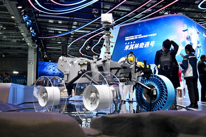 這是11月6日在第七屆進(jìn)博會(huì)汽車展區(qū)拍攝的在亞洲首次亮相的米其林月球探測(cè)車輪胎。新華社發(fā)(陳浩明攝)