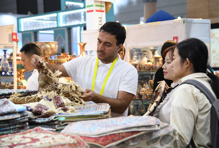 2024年9月20日,在陜西省西安市舉行的第八屆絲綢之路國際博覽會上,來自伊朗的參展商(前左一)向觀眾介紹產(chǎn)品。新華社記者張博文攝