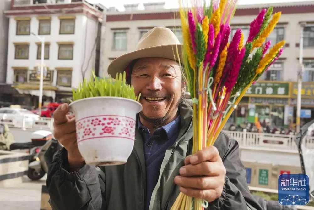 2月24日,商販在拉薩街頭售賣青稞苗和新年飾物。新華社記者晉美多吉攝