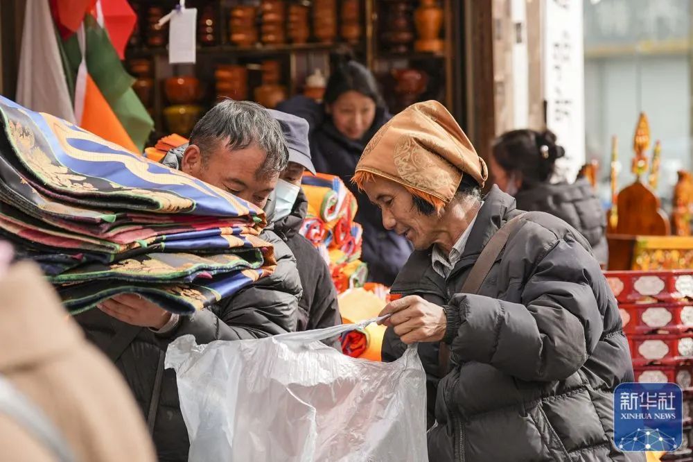 2月24日,顧客在拉薩街頭購買藏式門簾。新華社記者晉美多吉攝