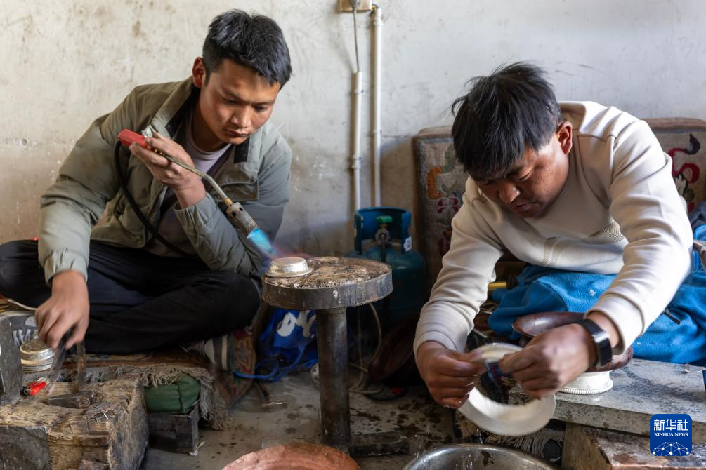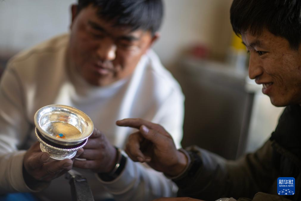 3月6日,扎西吉彩的手工匠人在給銀器塑形。新華社記者姜帆攝