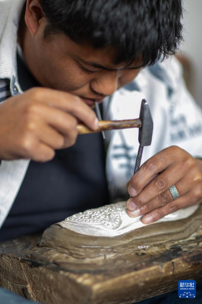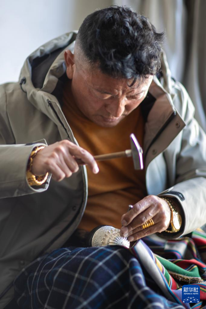3月6日,扎西吉彩的手工匠人在鏨刻銀器。新華社記者姜帆攝