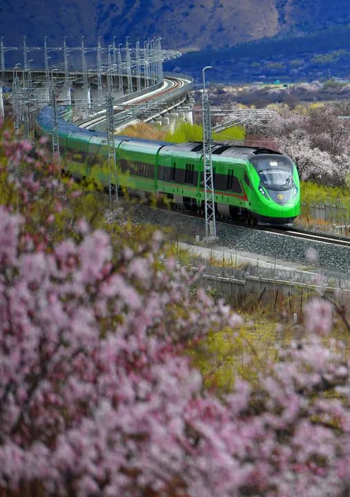 2023年3月21日,復(fù)興號列車穿行在西藏拉林鐵路林芝段的桃花間。新華社記者覺果攝