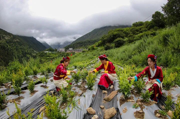 2022年,安徽省援藏工作隊在勒布溝引入莓茶種植,試驗性種植30畝。這是當?shù)卮迕裨诓烧瑁?023年7月28日攝)。新華社記者旦增尼瑪曲珠攝