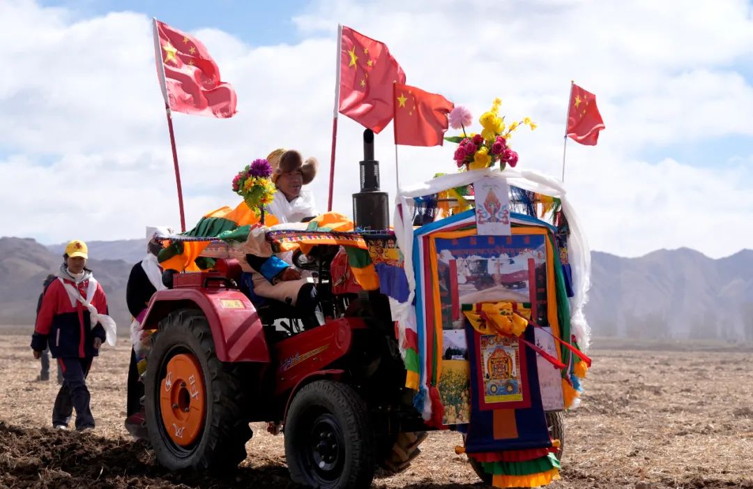 2025年3月16日,西藏拉薩強嘎鄉(xiāng)春耕儀式現(xiàn)場。拖拉機被盛裝打扮,祈求風(fēng)調(diào)雨順、農(nóng)業(yè)豐收。中新社記者李林?jǐn)z