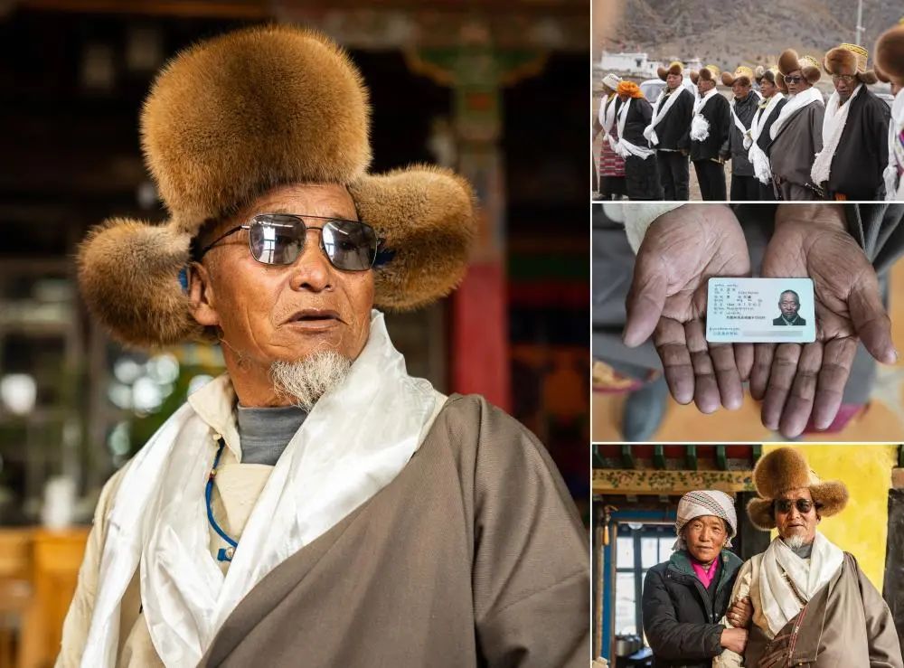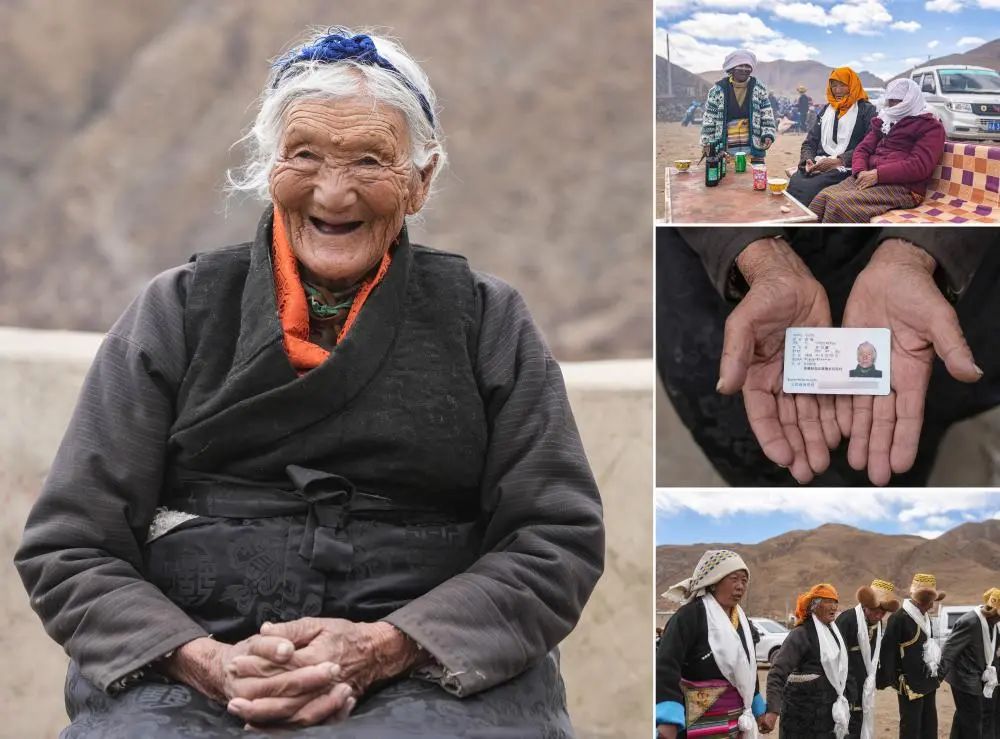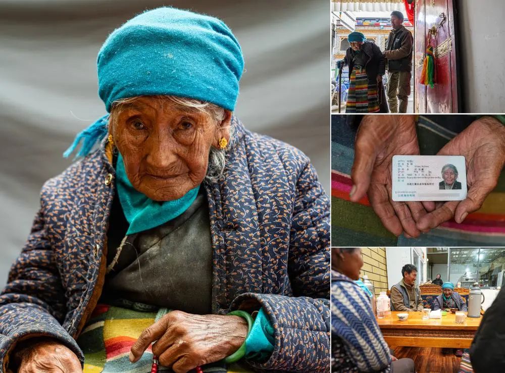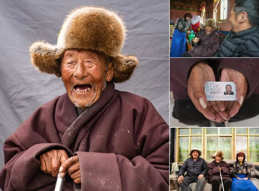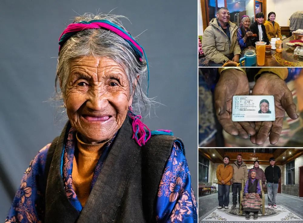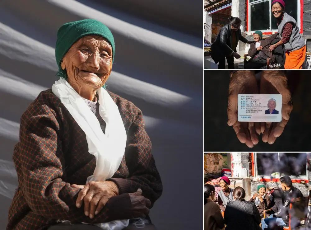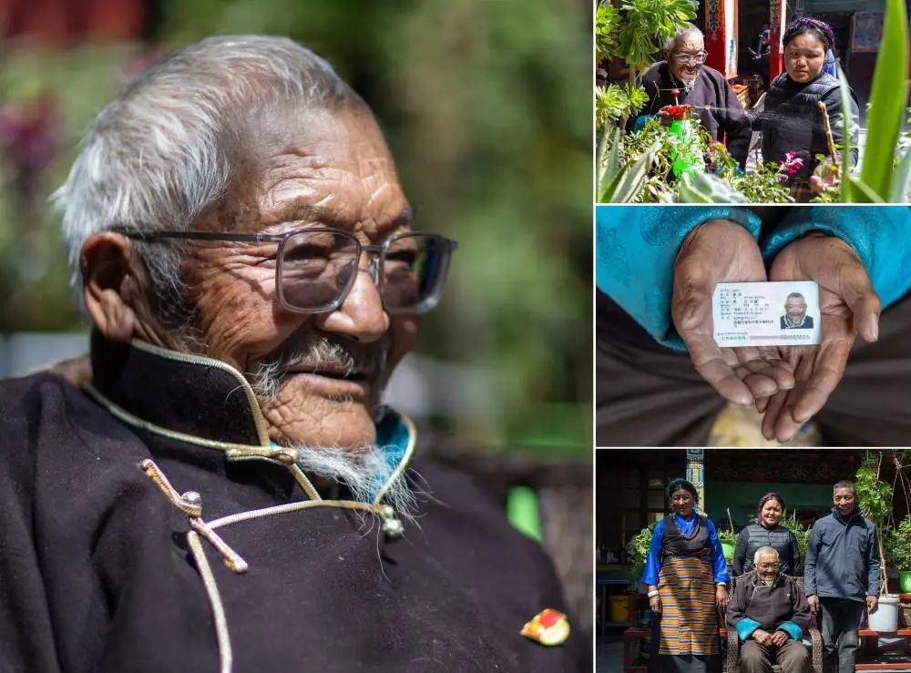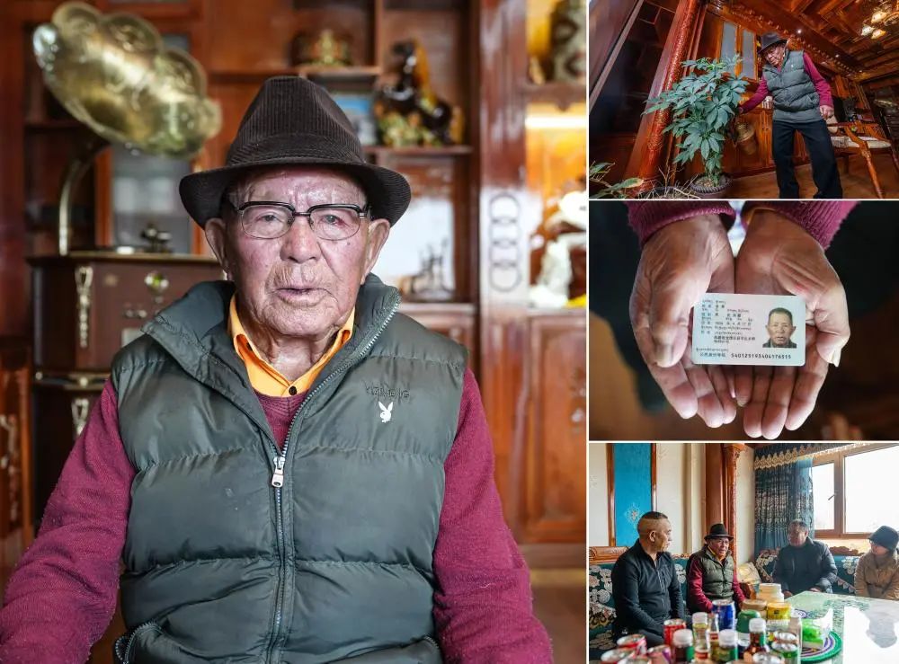 這是一張拼版照片。左:這是索扎老人的肖像(3月20日,新華社記者晉美多吉攝)。右上:索扎老人和家人聊天(3月20日,新華社記者晉美多吉攝)。右中:這是索扎老人的身份證(3月20日,新華社記者晉美多吉攝)。右下:索扎老人和家人合影(3月20日,新華社記者丁增尼達(dá)攝)。