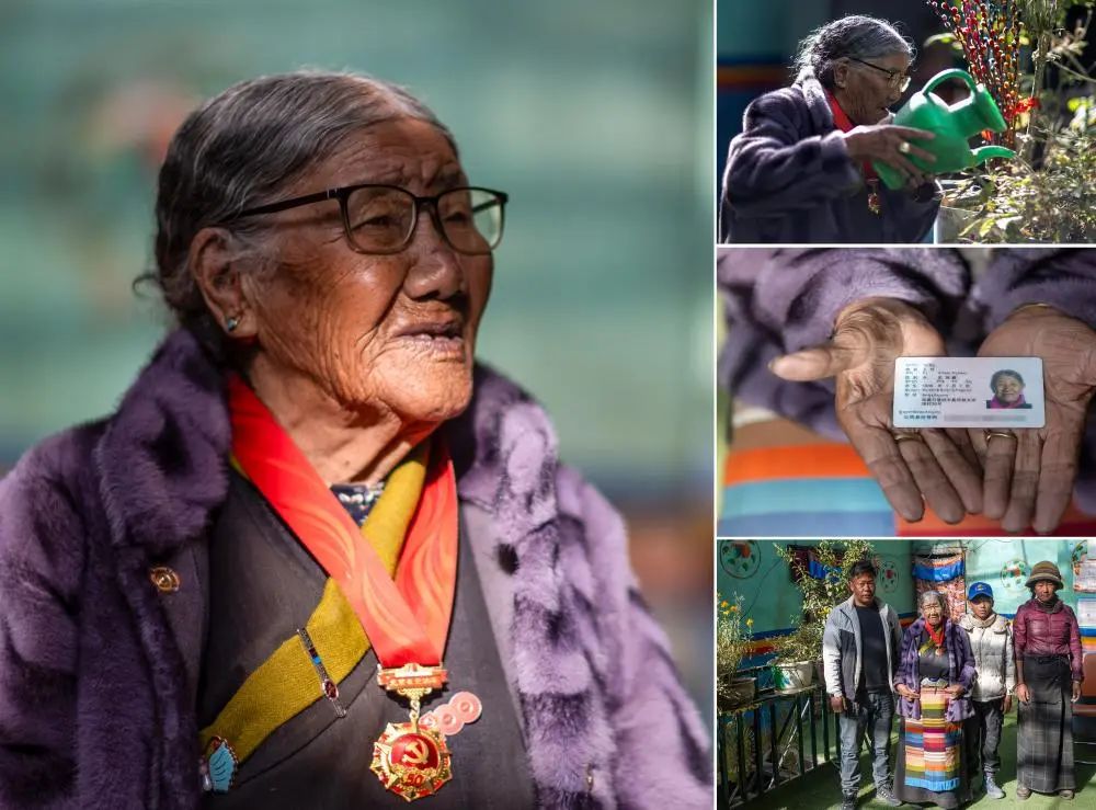 這是一張拼版照片。左:這是普瓊老人的肖像(3月17日,新華社記者姜帆攝)。右上:普瓊老人(左)在孫女的陪伴下澆花(3月17日,新華社記者姜帆攝)。右中:這是普瓊老人的身份證(3月17日,新華社記者姜帆攝)。右下:普瓊老人(前)與兒子歐珠(后右一)、兒媳曲宗(后右三)、孫女其美拉姆在家中合影(3月17日,新華社記者姜帆攝)。