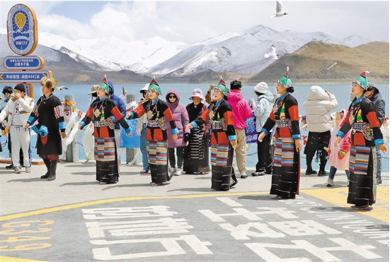 游客在羊卓雍錯(cuò)景區(qū)欣賞特色民族歌舞表演。西藏日?qǐng)?bào)記者丹增平措攝