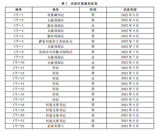 在收集定性數(shù)據(jù)的過程中,筆者采用訪談、座談會、文檔資料三種方法收集數(shù)據(jù)。在林芝市、工布江達(dá)縣、波密縣、米林縣、易貢茶廠、林芝噶瑪現(xiàn)代農(nóng)業(yè)產(chǎn)業(yè)園區(qū)、日喀則市、南木林縣、拉孜縣、薩麥村等地進(jìn)行實(shí)地調(diào)研,采用立意抽樣法與相關(guān)利益主體進(jìn)行了24人次訪談(見表2),每次訪談時間在1—2小時?!拔幕a(chǎn)業(yè)賦能鄉(xiāng)村振興”涉及多元利益主體,包括政府、文旅部門、企業(yè)、農(nóng)牧民、村兩委等,因此在實(shí)施調(diào)查前,針對不同的主體身份制定了相對應(yīng)的訪談提綱,使得在開放式訪談中能夠獲得多方面多層次、反映不同利益群體訴求的數(shù)據(jù)。為了提高研究的信度,經(jīng)過文旅單位和村委會同意后,復(fù)印了相關(guān)的發(fā)展規(guī)劃和研究報告等材料。同時,采用座談會等形式,讓各部門匯報當(dāng)前發(fā)展現(xiàn)狀和存在的問題,并一起探討解決之道,最后對座談會內(nèi)容形成材料報告。