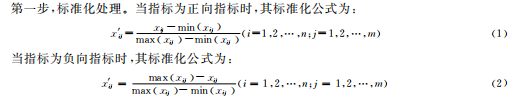 本文選用AHP—熵值法來確定指標(biāo)權(quán)重。AHP—熵值法是指分別利用層次分析法與熵值法對各指標(biāo)進(jìn)行主客觀賦權(quán),并將兩種權(quán)重相組合得到更為合理客觀的指標(biāo)權(quán)重。在已有的評價研究中,許多學(xué)者將兩種方法同時使用,并且取得了較好的效果。因此,為減少主觀因素對層次分析法賦權(quán)產(chǎn)生的主觀偏差,弱化因原始數(shù)據(jù)信息差異性較大而產(chǎn)生的客觀偏差等問題,本文采用主觀與客觀相結(jié)合的組合賦權(quán)方法,一定程度上保證了賦權(quán)的科學(xué)性。具體計算流程參考W.Luo和蔡雪雄的做法,計算步驟如下。