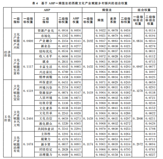 第二,數(shù)據(jù)和方法的角度。由于文化產(chǎn)業(yè)的多重屬性,其無法嚴(yán)格按照經(jīng)濟(jì)學(xué)方法進(jìn)行測度。因此,尋求文化產(chǎn)業(yè)在鄉(xiāng)村振興中的價值全面度量和指標(biāo)設(shè)計具有一定的學(xué)術(shù)價值和現(xiàn)實(shí)意義。為此,筆者按照“建立評估模型—篩選評估指標(biāo)—賦予指標(biāo)權(quán)重—實(shí)證測度”的步驟,采用德爾菲法選取對西藏文化產(chǎn)業(yè)賦能鄉(xiāng)村振興水平具有代表意義的主觀指標(biāo),使用AHP—熵值法對各指標(biāo)進(jìn)行量化并賦予權(quán)重,最后采用線性加權(quán)和法構(gòu)建文化產(chǎn)業(yè)賦能鄉(xiāng)村振興的綜合評價模型,為相關(guān)研究提供新的實(shí)證與數(shù)據(jù)思路。