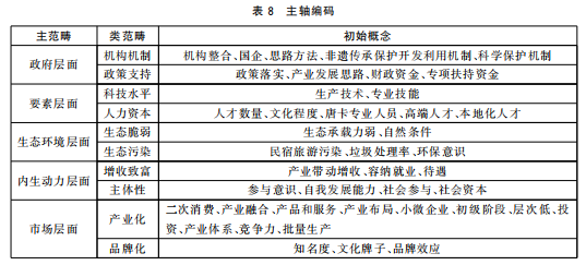 (2)主軸編碼。主軸編碼旨在發(fā)現(xiàn)并建立主要范疇之間潛在邏輯聯(lián)系和演化規(guī)律,從而歸納得出資料中各部分的有機(jī)關(guān)聯(lián)。本文依據(jù)范疇的屬性、概念層次及邏輯關(guān)系概括得出5個主范疇,包括政府層面、市場層面、要素層面、生態(tài)環(huán)境層面、內(nèi)生動力層面(見表8)。