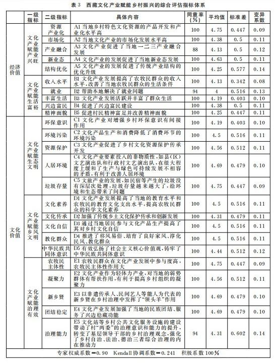 第一,就指標(biāo)體系構(gòu)建而言,本文通過兩輪專家德爾菲法,最終形成了包含5個一級指標(biāo)、25個二級指標(biāo)的“西藏文化產(chǎn)業(yè)賦能鄉(xiāng)村振興的綜合評估指標(biāo)體系”,咨詢專家權(quán)威系數(shù)和Kendall協(xié)調(diào)系數(shù)分別為0.90、0.241,賦值均數(shù)在4—4.75之間,變異系數(shù)在0.09—0.14之間,同意率≥0.75,專家意見較一致,函詢結(jié)果較可靠,該評價工具可作為西藏有關(guān)政府部門制定、完善相關(guān)政策的參考。