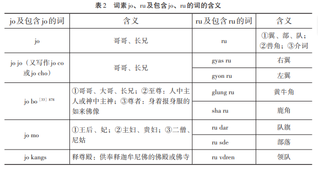如表2所示,首先,詞素jo和ru均有實義,然而在語法層面二者需要根據(jù)語境,搭配相應的詞綴或修飾語(或中心語)才能構成復合詞。其次,jo經歷了從單純詞向復合詞漸變的過程,其演變路徑有二:①在jo后附加詞綴bo,構成復合詞jo bo;②jo重疊,構成復合詞jo jo。詞典中jo(jo bo)各義項的排列次序恰恰與歷代藏文文獻反映的該詞的詞義演變歷程相合,且歷代藏文文獻呈現(xiàn)了該詞多重詞義并存的情況。