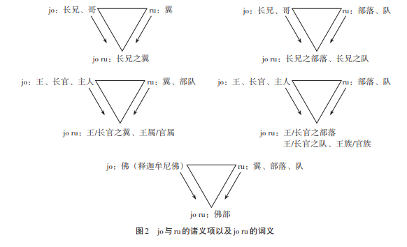 其三,若jo(或jo bo)取“佛(釋迦牟尼佛)”義,結合ru“部”的義項,在史詩語域中jo ru的社會語義當為佛部??梢姡梢宰屝叛?、文化象征、神圣觀念等在內的各種超越姓名本身的社會事項凸顯出來。