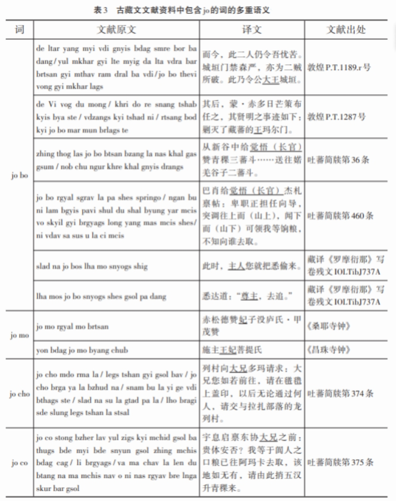 實際上,jo及包含jo的詞在藏文史料中使用較早,最早可上溯至吐蕃時期。據(jù)敦煌古藏文文獻,包含jo的詞jo bo、jo mo等在史料中并不鮮見,詳見表3。