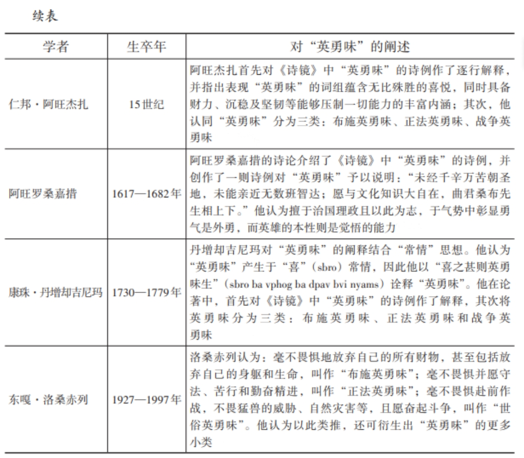 繼薩班之后,歷代學者以廣注、意解、釋難、概論、字解等形式詮釋梵語詩學(尤其是檀丁的《詩鏡》)乃至“十明”文化的闡釋實踐不絕于史,從而形成源遠流長的藏族詩學理論闡釋傳統(tǒng),而對英勇之詩味的解讀和對英雄形象的闡述也隨之在深度和廣度方面得以拓展,詳見表1。