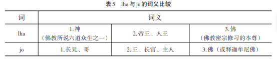 此外,通過對lha sras文本詞義和社會語義的分析,不難發(fā)現(xiàn)lha與jo的詞義重疊或交叉現(xiàn)象(見表5),而此類現(xiàn)象又可以作為闡釋個人名jo ru社會語義的維度之一。