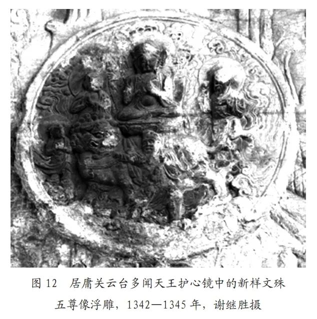 新樣文殊定型后對(duì)西夏佛教產(chǎn)生了直接影響?,F(xiàn)存榆林窟第3、29窟,東千佛洞第5、6窟;五個(gè)廟石窟第1、4窟和俄藏黑水城出土的唐卡等遺存即是其中重要的代表?,F(xiàn)存實(shí)例不僅有以絹畫為代表的以五臺(tái)山文殊信仰為中心的文殊化現(xiàn)圖(圖3),更多的則是文殊變中的新樣文殊五尊和三尊像,其中五尊像更為流行。眾所周知,西夏佛教在充分吸收漢傳佛教的同時(shí)也大量融合藏傳佛教,榆林窟第3窟即是西夏佛教融合漢藏佛教于一體的重要實(shí)例之一,該窟不僅配置有藏傳題材壁畫,還繪有文殊與普賢并出的大型壁畫,其中文殊變與敦煌EO.3588絹畫文殊化現(xiàn)圖相似,該壁畫也描繪了五臺(tái)山風(fēng)景和新樣文殊五尊像(圖11),同時(shí)在文殊變普賢變最上方繪有兩個(gè)同心圓構(gòu)圖的作品,其中前者又繪有新樣文殊五尊像。1342—1345年元廷修建的北京居庸關(guān)云臺(tái)中多聞天王護(hù)心鏡上的新樣文殊五尊浮雕與此基本相同(圖12)。據(jù)居庸關(guān)云臺(tái)鐫刻的漢文、藏文、西夏文等題記,元朝的帝師、黨項(xiàng)羌后裔等蒙古、藏、漢、黨項(xiàng)等各民族官員和工匠參與了居庸關(guān)云臺(tái)的修建,因此這一題材及其構(gòu)圖傳自西夏。通過(guò)比較發(fā)現(xiàn),西藏夏魯寺元代新樣文殊壁畫也與此二者高度相似,構(gòu)圖和人物組合尤其與居庸關(guān)浮雕一致,只是脅侍人物的位置略有差異。由此勾勒出一條同心圓構(gòu)圖的新樣文殊從西夏榆林窟第3窟傳至元代北京居庸關(guān)云臺(tái),而后與西藏夏魯寺相連的時(shí)間和空間脈絡(luò)。