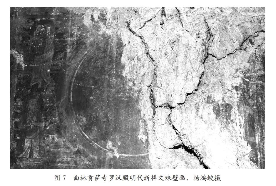 日喀則市昂仁縣的曲林貢薩寺(?????????????????)羅漢殿也保存有一幅新樣文殊壁畫。壁畫位于西壁,因右半部分殘損而被定為獅子吼文殊及其眷屬(圖7)。通過(guò)與漢傳原型和夏魯寺、白居寺同一題材圖像比較,該圖像表現(xiàn)的也是新樣文殊五尊像。與夏魯寺同一題材壁畫相比,該壁畫雖同樣采用同心圓構(gòu)圖,但只有主尊文殊及其獅子構(gòu)圖在圓內(nèi),而其余脅侍均對(duì)稱地構(gòu)圖在同心圓外兩側(cè)。圓內(nèi)的主尊文殊已殘,唯獅子大部分身軀尚存,獅子回首低頭怒吼。圓外左上描繪的僧人立像面部側(cè)向中心文殊,身著袒右袈裟,應(yīng)為佛陀波利;其下、亦即圓外左下的立像也側(cè)向主尊,頭戴五葉冠、上身環(huán)披帛帶、雙手當(dāng)胸結(jié)說(shuō)法印、跣足而立,表現(xiàn)的應(yīng)是善財(cái)童子。右側(cè)圓外圖像雖因壁畫嚴(yán)重殘損,仍能分辨出上下兩身人物的輪廓,應(yīng)分別為大圣老人和于闐王,其中右下面部側(cè)向主尊、頭纏白色頭巾的于闐王的頭部依稀可見。該寺始建年代缺載,但根據(jù)殿內(nèi)壁畫的上師題記“曲杰祖師(?????????????????????????)”和壁畫風(fēng)格,既往研究將壁畫年代初步斷代為15—16世紀(jì)。