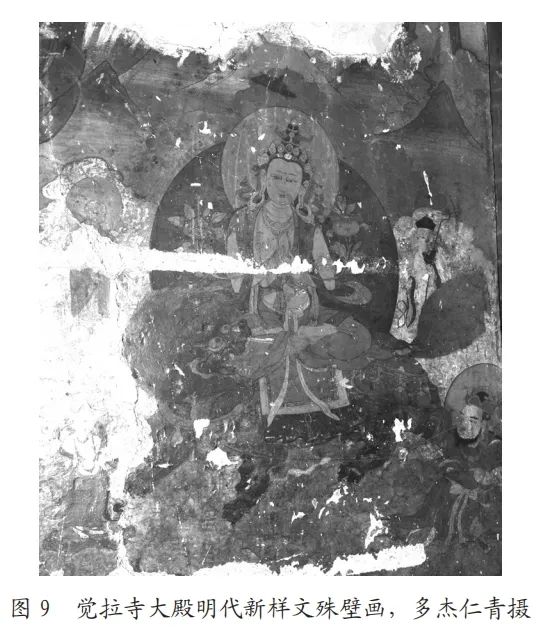 該題材壁畫位于山南市錯(cuò)那縣覺拉寺(????????????)一層大經(jīng)堂北壁主尊文殊菩薩像底部,畫面略斑駁(圖9)。新樣文殊五尊像構(gòu)圖在如意云團(tuán)上,主尊文殊雙手結(jié)轉(zhuǎn)法輪印端坐于獅子身上,雙肩蓮花上分別繪寶劍和法器,獅子回首怒吼。左上僧裝立像側(cè)向主尊,身著袈裟,雙手當(dāng)胸已殘,為佛陀波利;左下立像為側(cè)向主尊、雙手當(dāng)胸合十、頭梳抓髻、裸露上身、環(huán)披帛帶、跣足而立的善財(cái)童子;右上側(cè)為頭戴黑帽、胡須花白、身著寬袖大袍、左手持手杖、右手持念珠,側(cè)向主尊躬身而立的大圣老人;右下側(cè)向主尊、身體后仰、雙足前蹬、雙手奮力拉韁繩者,顯然為馭獅的于闐王。該寺修建年代也不詳,但從壁畫風(fēng)格特點(diǎn)可推知,此鋪壁畫應(yīng)繪于16—17世紀(jì)初的明末。