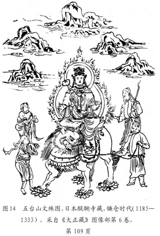 白居寺羅漢殿的新樣文殊彩塑和覺拉寺壁畫正是五臺(tái)山文殊信仰在西藏的完美詮釋和藝術(shù)展現(xiàn)。白居寺羅漢殿新樣文殊五尊像彩塑正如前述供奉在巨大的山巖紋龕中,同時(shí)在龕頂?shù)膸r山上矗立著5座巨大的山峰,中央山峰最高,同時(shí)每座山峰頂部都建有1—2座藏漢合璧的建筑:底部為藏式碉樓,頂部為2—3層漢式琉璃瓦建筑,5座山峰及其建筑無(wú)疑就是五臺(tái)山及其寺廟的象征,與當(dāng)代白居寺僧人在左上龕頂山巖紋底部粘貼的藏文“漢地五臺(tái)山(???????????????????)”的說(shuō)明完全吻合(圖5)。與此同時(shí),覺拉寺新樣文殊五尊像的頂部也繪有不同色彩的5座山峰,無(wú)疑也是五臺(tái)山的象征(圖9)。實(shí)際上,日本醍醐寺藏鐮倉(cāng)時(shí)代(1185—1333)受敦煌新樣文殊直接影響的“五臺(tái)山文殊”白描圖也有相似的表現(xiàn)。該圖將新樣文殊五尊像構(gòu)圖在中前位置,其后構(gòu)圖了一大四小的5座環(huán)形小山,以象征五臺(tái)山(圖14)。由此可知,白居寺羅漢殿彩塑和覺拉寺壁畫對(duì)五臺(tái)山及其文殊的表現(xiàn)也應(yīng)受到漢傳佛教的啟迪,二者組像背龕中的山巖及其上方的5座山峰,尤其是彩塑的五峰中還矗立著數(shù)座寺院建筑清楚表明,它們無(wú)疑就是五臺(tái)山的象征,而下部佛龕中供奉的新樣文殊五尊像就是五臺(tái)山駐錫的文殊菩薩及其脅侍。換言之,二者表現(xiàn)的就是漢地五臺(tái)山及其中駐錫的文殊菩薩眷屬。與此相比,西藏現(xiàn)存其他新樣文殊遺存雖然只表現(xiàn)了五尊像本身,省略了五臺(tái)山及其寺院的描繪,但毋庸置疑其表現(xiàn)的主旨與此二者一脈相承。