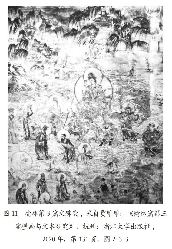 從唐末、宋、西夏的五臺(tái)山信仰遺存可知,新樣文殊五尊像多出現(xiàn)于文殊變和五臺(tái)山文殊化現(xiàn)圖中,其中包括佛陀波利和大圣老人這兩位五臺(tái)山文殊信仰靈驗(yàn)的標(biāo)志性人物。例如,EO.3588文殊菩薩化現(xiàn)圖絹畫和西夏榆林窟第3窟文殊變就是其中的代表。在EO.3588絹畫中,中心騎獅的文殊菩薩兩側(cè)分別繪有兩位脅侍菩薩立像,左前為善財(cái)童子,右前為馭獅的于闐王;同時(shí)在畫面四周構(gòu)圖的則是高低起伏、大小不等的五臺(tái)山群山,寺院建筑錯(cuò)落其間,并且題有題記,而佛陀波利和大圣老人則構(gòu)圖在主尊像前的山巒之中(圖3)。榆林窟第3窟文殊變壁畫與此類似,騎獅的文殊和新樣文殊五尊像構(gòu)圖在五臺(tái)山群峰之中,與絹畫相比,只是其中的寺院缺乏題記而已(圖11)。與此相對(duì),新樣文殊三尊像則絕少出現(xiàn)在上述題材中,同時(shí)缺少佛陀波利和大圣老人這兩位靈驗(yàn)人物,因此與五臺(tái)山文殊信仰密切相關(guān)的五尊像就成為西藏新樣文殊遺存中流行的唯一組像。