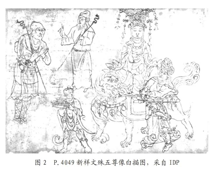 學(xué)術(shù)界據(jù)此隨即對(duì)敦煌出土的以P.4049白描畫稿為首的白描、版畫和絹畫展開研究。P.4049白描畫稿繪有五身人物(圖2),比220窟壁畫多出兩位。榮新江根據(jù)北宋妙濟(jì)大師延一著作《廣清涼傳》中“菩薩化身為貧女”“朔州慈勇大師”、佛經(jīng)《阿婆縛抄》卷99和日僧圓仁(794—864)的《入唐求法巡禮行記》卷3“開成五年(840)七月二日”條故事記載,首次考證出其中“扶杖合十的比丘為佛陀波利無(wú)疑”,而“披發(fā)長(zhǎng)者應(yīng)是大圣老人”,并且認(rèn)為新樣文殊題材和圖像來(lái)源于五臺(tái)山本土傳說(shuō),而非于闐,在唐末定型,系此時(shí)期西北各民族交融的例證。其中的文殊菩薩、善財(cái)童子、于闐王、佛陀波利和大圣老人(或文殊老人)又被稱為新樣文殊五尊。沙武田在對(duì)敦煌研究所提出的新樣文殊的“新樣”要點(diǎn),亦即文殊單獨(dú)出現(xiàn)和側(cè)面像兩點(diǎn)提出質(zhì)疑的同時(shí),不同意榮新江提出的P.4049白描畫稿系220窟新樣文殊壁畫粉本的觀點(diǎn),并且認(rèn)為EO.3588絹畫組像雖然與新樣文殊五尊相同(圖3),但因繪有五臺(tái)山風(fēng)景,應(yīng)屬于“傳統(tǒng)五臺(tái)山文殊信仰的一部分”。