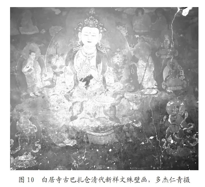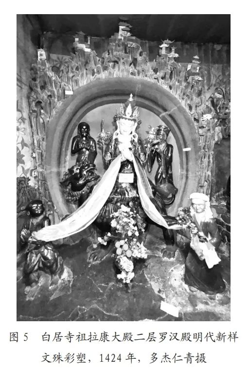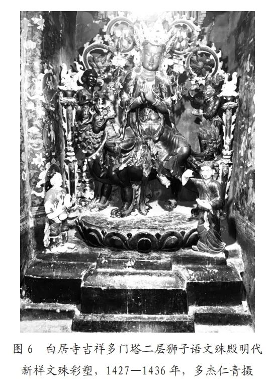 白居寺保存有3個(gè)新樣文殊實(shí)例,其中兩個(gè)為明代彩塑,分別位于祖拉康主殿二層的羅漢殿和吉祥多門塔二層?xùn)|南的獅子語(yǔ)文殊殿。