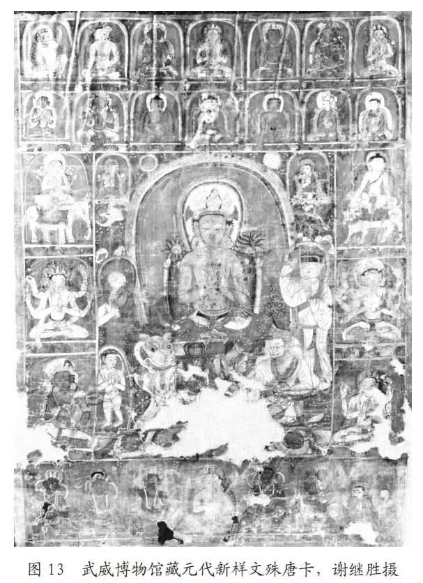 如果說(shuō)融合藏傳佛教題材的榆林窟第3窟和居庸關(guān)云臺(tái)浮雕中的新樣文殊遺存對(duì)于該題材圖像在西藏的傳播仍缺乏說(shuō)服力,那么,1989年甘肅武威市新華鄉(xiāng)亥母洞出土的新樣文殊唐卡則為這一題材和圖像的傳播提供了明確的證據(jù),因?yàn)樵撎瓶ㄒ孕聵游氖鉃橹饕}材,是已知藏傳佛教藝術(shù)中最早的新樣文殊作品。該唐卡采用藏傳佛教藝術(shù)傳統(tǒng)的棋格式構(gòu)圖,描繪有35身諸佛菩薩和高僧大德像,中心為新樣文殊五尊像(圖13)。賈維維首先辨識(shí)出該題材,認(rèn)為該唐卡是西夏時(shí)期“漢藏藝術(shù)風(fēng)格和顯密結(jié)合的圖像”??,常紅紅在此基礎(chǔ)上對(duì)這一題材的外延與內(nèi)涵又進(jìn)行了更為系統(tǒng)、深入的探討。她在上師像中辨識(shí)出薩迦班智達(dá)(1182—1251)和八思巴(1235—1280)像的基礎(chǔ)上,結(jié)合尼泊爾風(fēng)格元素,認(rèn)為該唐卡繪制于13世紀(jì)末至14世紀(jì),其形成與薩迦班智達(dá)和八思巴等薩迦派上層人士密切相關(guān)。通過(guò)與前述西藏現(xiàn)存新樣文殊遺存的比較可知,除風(fēng)格外,二者的人物組合、構(gòu)圖和法器都基本相同。首先,二者的人物組合完全相同,均為新樣文殊五尊像;其次,在構(gòu)圖上,唐卡的中心為騎獅文殊,其左側(cè)上下分別構(gòu)圖佛陀波利和善財(cái)童子,同時(shí)在其右側(cè)上下分別對(duì)稱構(gòu)圖大圣老人和于闐王,這一構(gòu)圖模式與西藏前述新樣文殊的構(gòu)圖也完全一致;再次,以文殊為首的部分人物的法器也完全相同。文殊菩薩呈正面像,身著藏式菩薩裝,雙手當(dāng)胸結(jié)轉(zhuǎn)法輪印,雙腿結(jié)半跏趺坐,雙肩的蓮花分托寶劍和經(jīng)篋。這一裝束、造型和法器與西藏夏魯寺、白居寺羅漢殿和獅子語(yǔ)文殊殿、頓覺寺彩塑和壁畫完全一致,只有覺拉寺和白居寺古巴扎倉(cāng)壁畫與其略有差異,坐姿采用全跏趺坐而已。佛陀波利身著袈裟、雙手當(dāng)胸合十的特點(diǎn)與夏魯寺基本一致,而與頓覺寺和白居寺古巴扎倉(cāng)完全相同;善財(cái)童子環(huán)披帛帶、雙手當(dāng)胸合十、跣足而立的特點(diǎn)與西藏現(xiàn)存遺存基本一致;大圣老人胡須花白、左手持杖的特點(diǎn)也與西藏遺存相似,只是白居寺兩處彩塑遺存中的手杖已失;于闐王手執(zhí)韁繩的特點(diǎn)也在西藏所有遺存中具有表現(xiàn)。上述這些高度相似性表明,武威新樣文殊唐卡是迄今已知將漢傳佛教新樣文殊最早融入藏傳佛教藝術(shù)的作品,其模式對(duì)西藏現(xiàn)存新樣文殊遺存無(wú)疑產(chǎn)生了直接或間接的影響。與此同時(shí),鑒于薩迦班智達(dá)和八思巴于1246年曾到武威與闊端會(huì)談,叔侄二人在后世被認(rèn)為是文殊菩薩的化身,尤其是八思巴長(zhǎng)期在大都擔(dān)任元代管理西藏行政事務(wù)和全國(guó)佛教事務(wù)中央機(jī)構(gòu)宣政院的首領(lǐng),帝師喜幢吉祥賢曾參與居庸關(guān)云臺(tái)的修建,以及夏魯寺和白居寺與薩迦派之間的特殊關(guān)系等史實(shí),西藏現(xiàn)存新樣文殊遺存很可能由薩迦派在元代傳入西藏,最早傳入薩迦寺,而后傳入夏魯寺,逐漸成為藏傳佛教流行的題材之一。