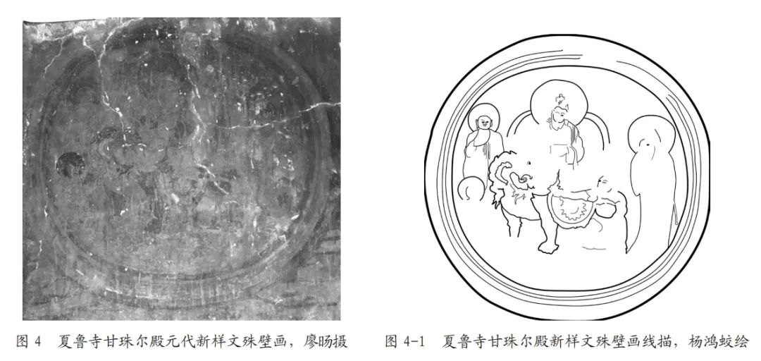 壁畫位于夏魯寺大殿一層集會(huì)大殿東面南側(cè)甘珠爾殿殿門左上方,新樣文殊構(gòu)圖在大量云紋上的同心圓內(nèi)(圖4和4-1)。壁畫雖因長(zhǎng)期燈熏十分模糊,細(xì)節(jié)難辨,但輪廓仍依稀可見。畫面繪有五身人物,頭部均繪有圓形頭光。中心為菩薩裝騎獅的文殊,細(xì)節(jié)不清,獅頭回首張口怒吼;獅子右前為牽獅狀的黑膚色立像,但細(xì)節(jié)不清,應(yīng)為于闐王;文殊左上方為僧裝人物,右肩披覆袈裟,右手當(dāng)胸,細(xì)節(jié)不清,應(yīng)為佛陀波利;左下方繪有一位立像,除面目外,其余細(xì)節(jié)不清,應(yīng)為善財(cái)童子;文殊右側(cè)同時(shí)有一身俗裝立像,側(cè)向文殊,身著長(zhǎng)袍,褒衣博帶,細(xì)節(jié)不清,應(yīng)為大圣老人。與敦煌出土的P.4049白描對(duì)比,構(gòu)圖雖略有差別,但人物數(shù)量及其造型基本相同,據(jù)此可以確定其題材為新樣文殊。按《后藏志》,該殿應(yīng)與同層的犀牛殿等佛殿一起建于古相扎巴堅(jiān)贊(1306—1333年在任)就任夏魯萬(wàn)戶長(zhǎng)后對(duì)夏魯寺進(jìn)行的大規(guī)模擴(kuò)建時(shí)期,同時(shí)結(jié)合風(fēng)格特點(diǎn),該壁畫應(yīng)繪制于14世紀(jì)初,是西藏已知時(shí)代最早的新樣文殊遺存。