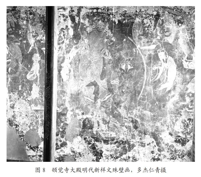 日喀則市白朗縣的頓覺寺(??????????????)大殿也保存有一鋪新樣文殊壁畫(圖8)。壁畫除部分起甲而剝落外,基本完整。構(gòu)圖與前述壁畫構(gòu)圖不同,不是將該題材作為眷屬構(gòu)圖在壁面的同心圓內(nèi),而是作為主要題材構(gòu)圖在畫面中央,同時(shí)在四周配置有大量脅侍像。中心主尊文殊雙手當(dāng)胸結(jié)轉(zhuǎn)法輪印,端坐于獅子之上,雙肩的蓮花分別托寶劍和經(jīng)篋。獅子回首怒吼,但細(xì)節(jié)不清。左上僧人立像身著藏式袈裟,雙手當(dāng)胸合十,應(yīng)為佛陀波利;其下側(cè)向主尊的立像,畫面已斑駁不清,應(yīng)為善財(cái)童子;右上為漢裝老人立像,頭戴金邊黑帽、胡須花白、身著寬袖長(zhǎng)袍、左手持杖、右手持念珠,側(cè)向主尊躬身而立,顯然表現(xiàn)的是大圣老人;其下人物頭戴高帽、身穿鎧甲側(cè)向主尊,右手前伸、左手當(dāng)胸曲臂,手臂向前張直和左手臂上纏繞的鐵鏈?zhǔn)中涯?,呈奮力牽獅狀。毋庸置疑,該人物表現(xiàn)的即是馭獅的于闐王。該寺修建年代缺載,但結(jié)合壁畫風(fēng)格和寺內(nèi)保存的兩口銅鍋上的藏文題記推測(cè),壁畫應(yīng)繪于16—17世紀(jì)的明末。