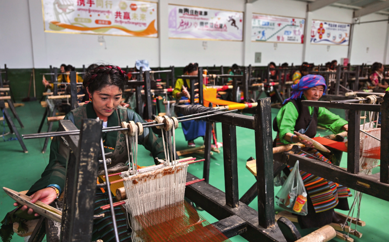 在西藏日喀則市仁布縣特色產業(yè)孵化園,亞德細褐羊毛織品農民專業(yè)合作社工作人員在車間里織布(2024年9月1日攝)孫瑞博攝
