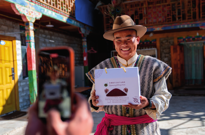在西藏日喀則市定結縣陳塘鎮(zhèn),自媒體博主夏爾巴人旦增在拍攝視頻推介當?shù)靥禺a雞爪谷糌粑(2024年12月13日攝)丁增尼達攝