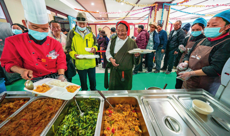 在西藏那曲市色尼區(qū)老年人日間照料中心,老人們在排隊打飯(2025年4月25日攝)丁增尼達攝