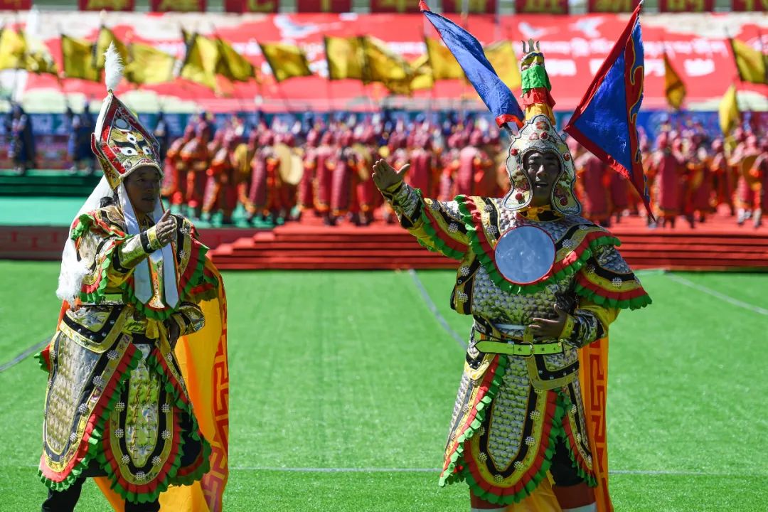 2019年8月10日,“2019年羌塘恰青格薩爾賽馬藝術(shù)節(jié)”在西藏自治區(qū)那曲市開幕。圖為開幕式上的《格薩(斯)爾》說唱表演。中新社記者何蓬磊攝