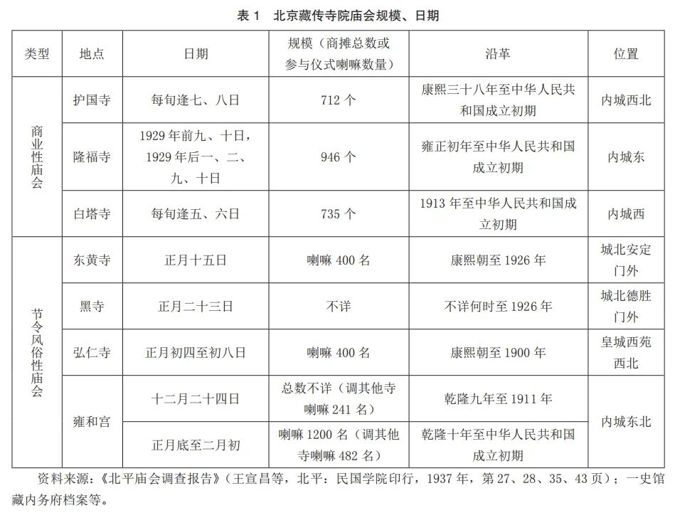另一方面,廟會的社會功能顯現(xiàn)。清中期至民國的北京社會發(fā)展是一個連續(xù)過程:旗、民從分置到融合,旗人平民化,國家管控降低,娛樂增多,內(nèi)城形成了豐富的市民社會。在此期間,通過商業(yè)性廟會、節(jié)令風(fēng)俗性廟會兩種形式,蒙藏習(xí)俗不斷被內(nèi)化為北京習(xí)慣,促進(jìn)了不同人群接觸。筆者根據(jù)文獻(xiàn)資料和學(xué)者研究歸納藏傳佛教寺院廟會時間、規(guī)模如下: