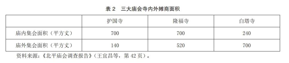 廟會的商戶將內(nèi)核外展為城市網(wǎng)絡(luò)。清中期時護(hù)國寺、隆福寺、白塔寺概念已不局限于寺院本身,而是隨著寺內(nèi)外的商戶擴(kuò)張為整個街區(qū)的代名詞。據(jù)20世紀(jì)30年代統(tǒng)計: