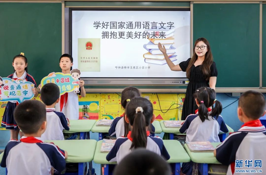 ▲6月23日,內(nèi)蒙古呼和浩特市玉泉區(qū)小召小學(xué)老師在班會上為學(xué)生講解《中華人民共和國國家通用語言文字法》相關(guān)知識。新華網(wǎng)發(fā)(丁根厚攝)
