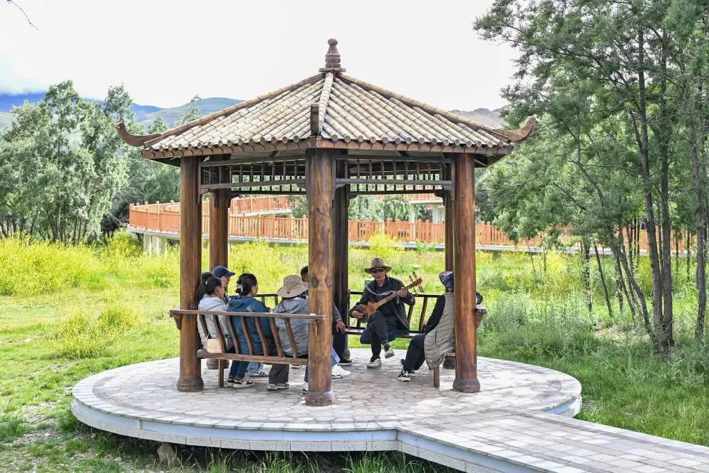 隆子縣居民在沙棘林生態(tài)公園彈奏樂器。新華社記者李鑫攝