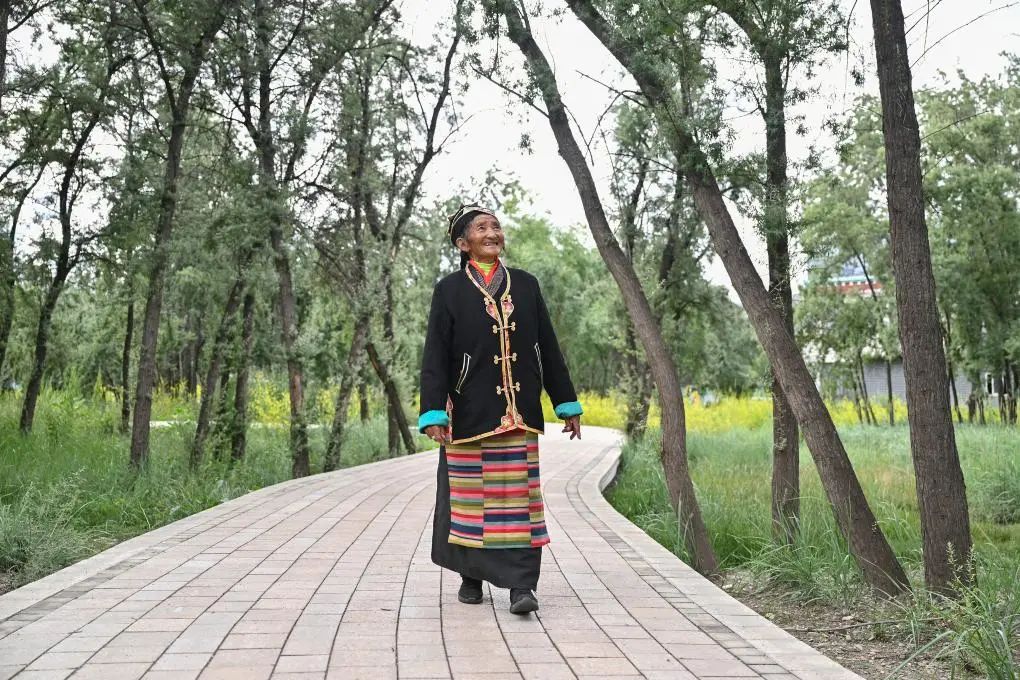 桑旦在隆子縣沙棘林生態(tài)公園內(nèi)散步。新華社記者李鑫攝