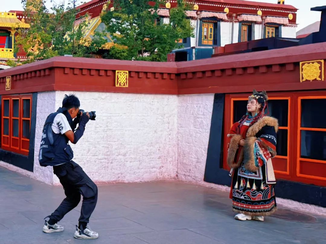 8月的拉薩,陽光傾灑,人流如織。在布達拉宮前和大昭寺廣場上,身著絢麗藏族服飾的游客隨處可見。他們在攝影師的指導下變換造型,沉浸于體驗“高原兒女”生活的獨特魅力。