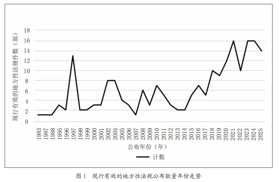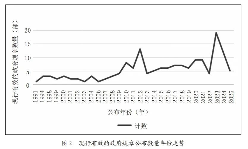 60年來,西藏自治區(qū)的立法工作取得了豐碩成果,形成“法規(guī)+規(guī)章”的多層次、全方位立法體系,為鑄牢中華民族共同體意識提供了豐富的制度資源。在地方性法規(guī)方面,自1983年至今(數(shù)據(jù)統(tǒng)計截至2025年7月3日),西藏自治區(qū)共發(fā)布564部地方性法規(guī)(統(tǒng)計數(shù)據(jù)涵蓋:有效305部、失效102部、部分失效2部、已修改154部、尚未實施1部;包括自治區(qū)級地方性法規(guī)413部、市級地方性法規(guī)151部),現(xiàn)行有效305部(圖1),其中2025年修改的21件法規(guī)通過合憲性審查,確保與國家法治統(tǒng)一。這些法規(guī)的制定和修改,緊密圍繞西藏的發(fā)展需求,不斷適應(yīng)時代變化。例如,隨著互聯(lián)網(wǎng)在西藏的普及,制定了網(wǎng)絡(luò)安全相關(guān)法規(guī),保障了西藏地區(qū)網(wǎng)絡(luò)空間的安全與穩(wěn)定,促進了信息時代下各民族的交流與發(fā)展。政府規(guī)章方面,1991—2025年間共公布182份(其中自治區(qū)級政府規(guī)章100部,市級政府規(guī)章82部),公布的政府規(guī)章在2012年達到次高峰、2023年達到高峰(圖2),修改或廢止類規(guī)章31份,占比17%。立法數(shù)量的增長與動態(tài)調(diào)整機制的形成,反映了西藏立法從“數(shù)量積累”到“質(zhì)量提升”的演進過程,也體現(xiàn)了法治建設(shè)對共同體意識培育的持續(xù)回應(yīng)。通過不斷完善立法體系,使法律更好地服務(wù)于西藏的經(jīng)濟社會發(fā)展,增強了各民族對法律的認同感和遵守法律的自覺性,進一步凝聚了共同體意識。