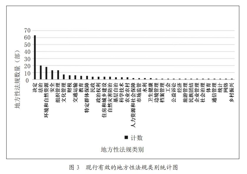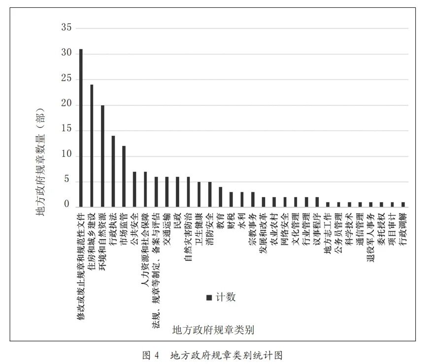 西藏自治區(qū)的立法體系具有廣泛的覆蓋性和深刻的社會功能,其內(nèi)容貫穿社會生活的各個領(lǐng)域,在鑄牢中華民族共同體意識的政治、經(jīng)濟、文化、社會等維度均發(fā)揮了重要的制度性作用?;诜梢?guī)范的調(diào)整對象與內(nèi)容屬性,本文對西藏自治區(qū)現(xiàn)行地方性法規(guī)與政府規(guī)章進行了系統(tǒng)化分類分析,最終確立了35類地方性法規(guī)(圖3)與31類政府規(guī)章(圖4)。地方性法規(guī)中,決定類法規(guī)(修改或廢止法規(guī)或規(guī)章的決定)占比最高(63份,31.0%);其次為法治類法規(guī)(20份,9.9%);環(huán)境和自然資源管理類法規(guī)占比次之(18份,8.9%)。政府規(guī)章中,修改或廢止規(guī)章和規(guī)范性文件類規(guī)章占比最高(31份,17.0%);其次是住房和城鄉(xiāng)建設(shè)類規(guī)章(24份,13.2%);再次是環(huán)境和自然資源管理類規(guī)章(20份,11.0%)。