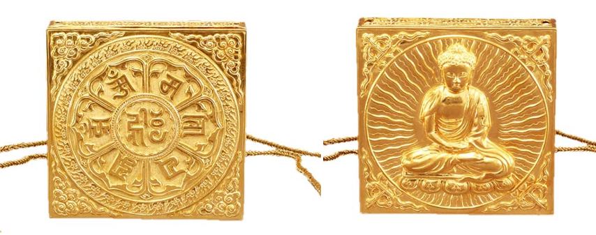 其中一件嘎烏出自明永樂二十二年(1424)沐昂側(cè)室夫人邢妙仙墓。該金盒邊長8.3厘米,厚1.7厘米,盒上方兩端有孔,可與一條長128厘米的金鏈相連,金鏈兩端為圓環(huán),頂部有可開合的U型扣。金盒內(nèi)部中空,可抽拉打開。盒外部一面的四角飾金剛杵頭形裝飾,中間為一圓環(huán),內(nèi)有全跏趺坐于覆蓮上的阿彌陀佛,雙手施禪定印,螺發(fā),肉髻,身著袒右式袈裟,衣紋褶皺自然,背后有毫光。另一面四角為如意云紋,中間自外向內(nèi)有三重圓環(huán),依次裝飾有火焰紋、蓮花紋與蘭札體梵文六字真言、蘭札體梵文種子字“紇哩”。盒側(cè)面為一圈如意云紋裝飾。