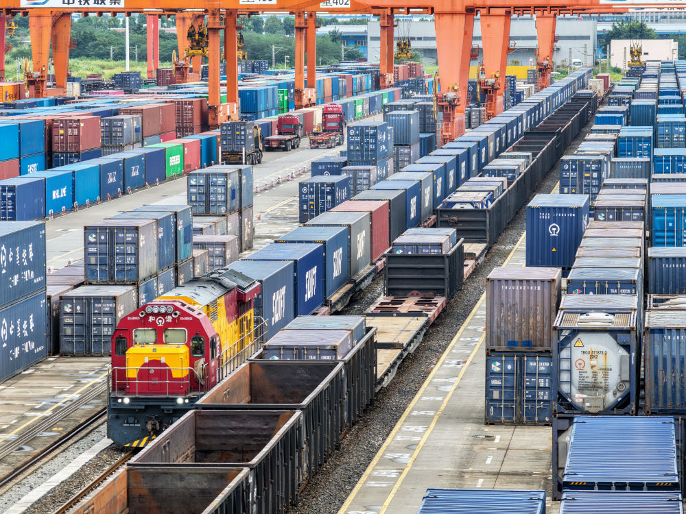 2025年9月8日,滿載“重慶造”汽車的中歐班列(成渝)在重慶團(tuán)結(jié)村中心站等待發(fā)車(無人機(jī)照片)。新華社記者唐奕攝