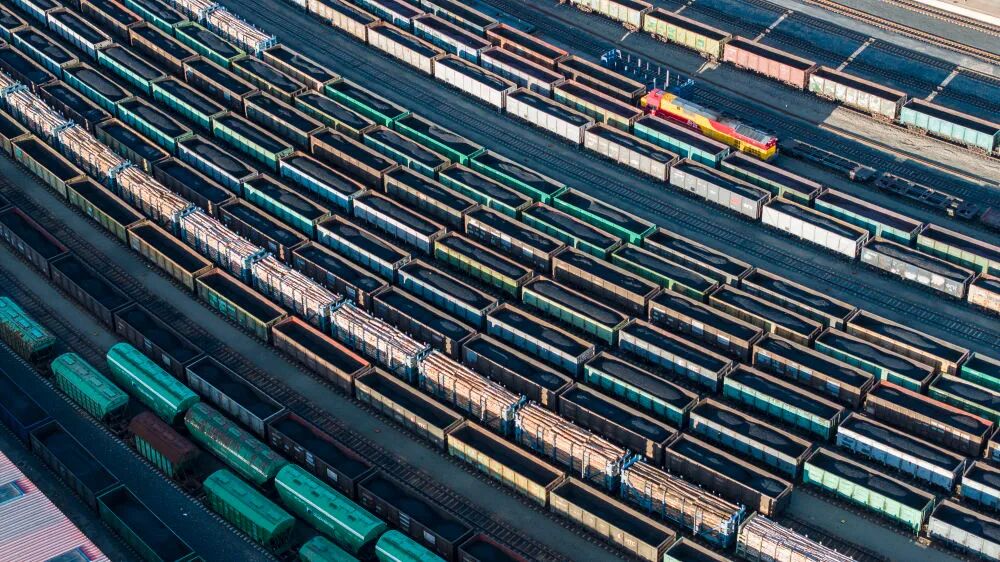 2025年10月18日,在中國鐵路哈爾濱局集團有限公司綏芬河站南場,滿載進口貨物的列車等待解體換裝(無人機照片)。新華社發(fā)(曲藝偉攝)